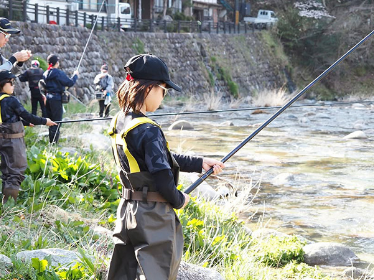 美しい雪解け水が流れる時季に開催される、家族向けのアマゴ釣り大会。