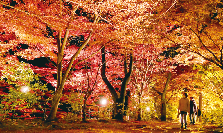 岡山県随一の紅葉の名所、夜にはライトアップもされ幻想的な雰囲気が楽しめる。