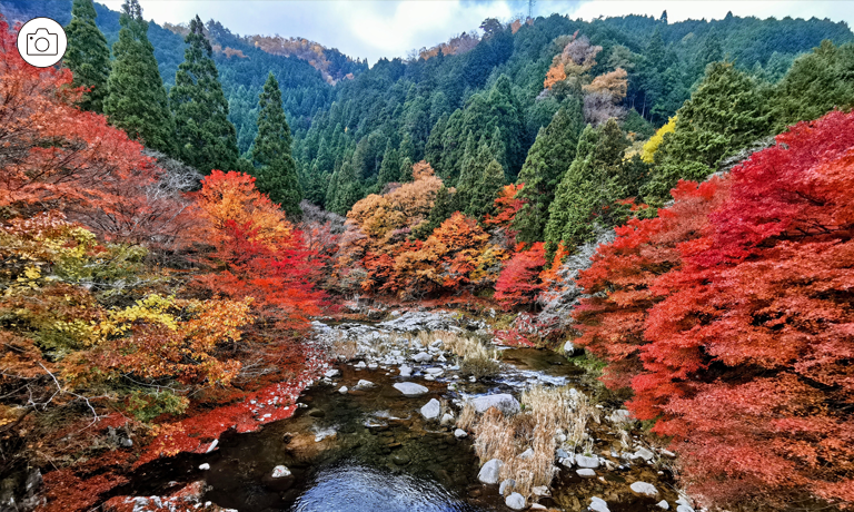 秋の紅葉は、鏡野町でも有数の美しさを誇る人気スポットとして知られ、美しい紅葉や紅の絨毯が撮影できる、SNS映えするスポットとして人気急上昇中です。