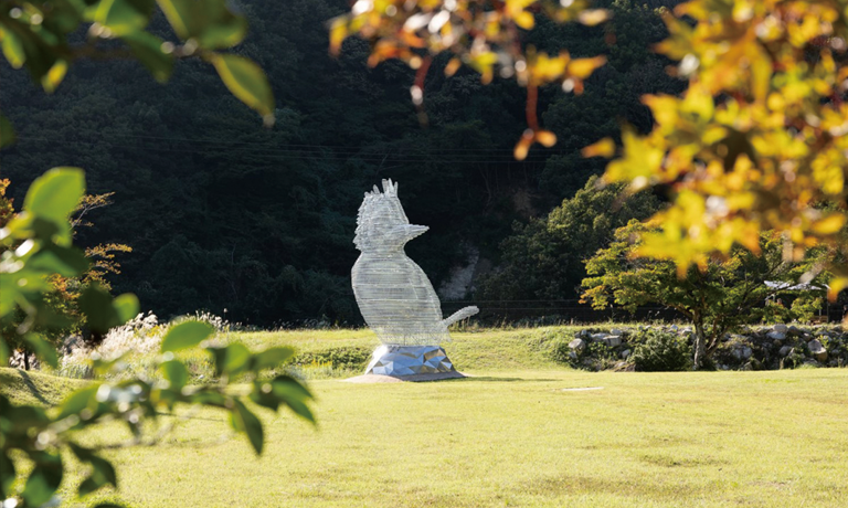 「山に響くこだま」は台湾出身の芸術家ジェンチョン・リョウ氏の作品で、大型彫刻作品です。本作品のモチーフとなっているヤマセミは、鏡野町全域に生息する町の鳥として親しまれており、岡山県の天然記念物にも指定されています。
