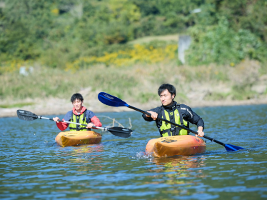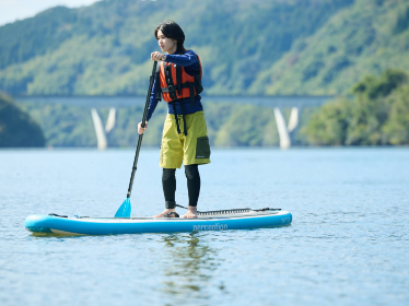 心開放感を味わえる抜群の自然環境の中で、地よい風を感じながら鏡野町の豊かな自然を満喫できるカヤックとSUP体験とを特別料金でご提供。