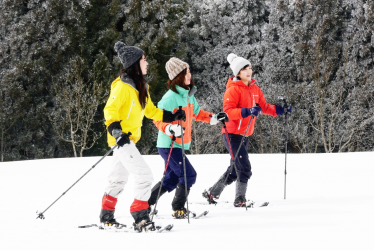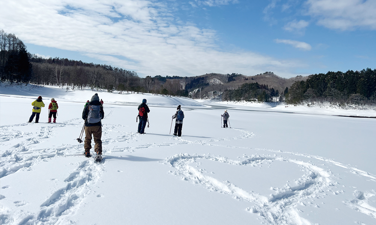 白樺やヤドリギが自生する、美しい雪景色の高原をスノーシューで歩きます。絶景が広がる恩原湖は、高低差が少なく、初心者でも安心してご参加いただけます。