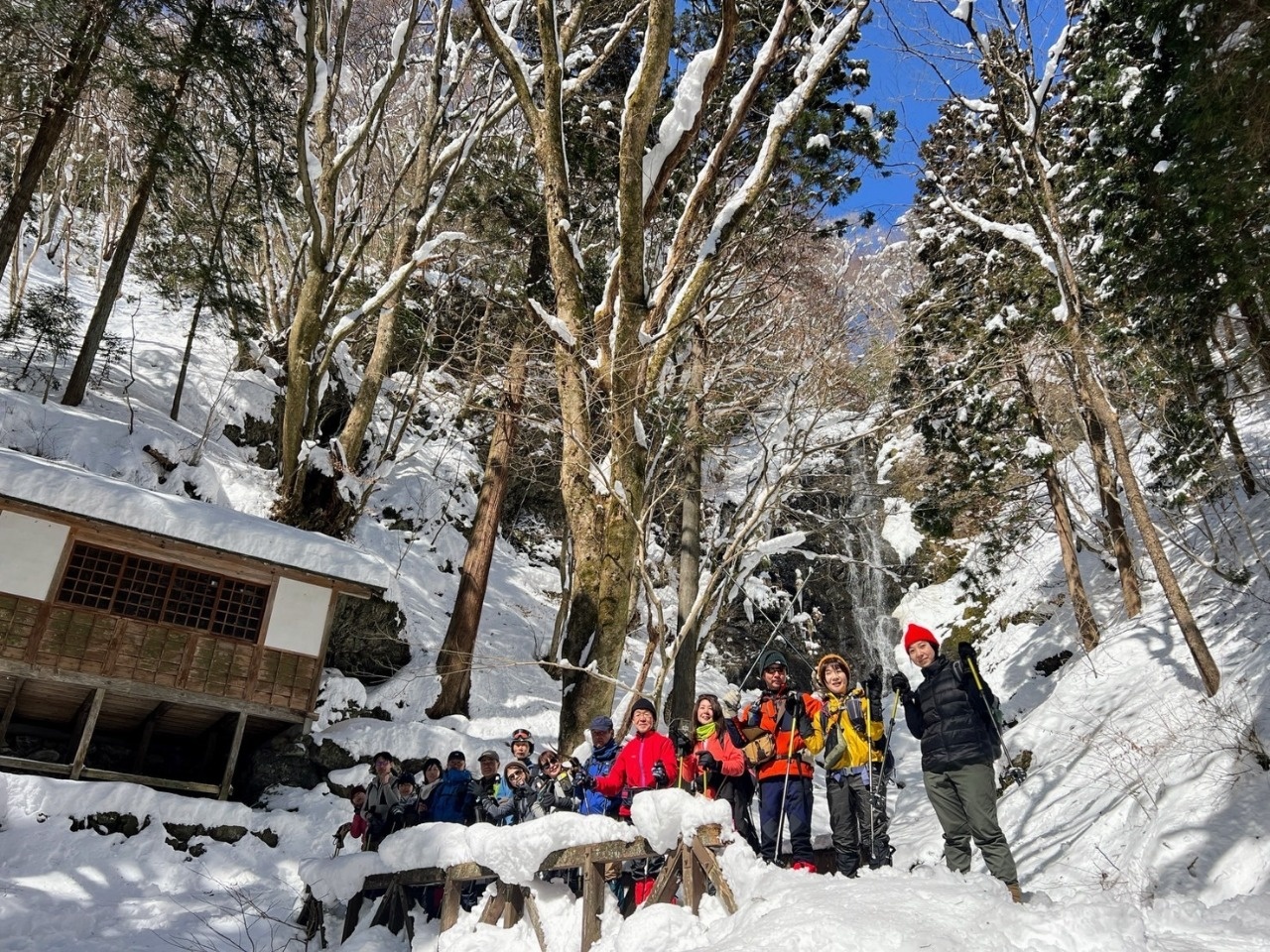 標高1209mの鏡野町を代表する「泉山」の登山口のひとつ「中林コース」の入り口から間もなく現れる落差40mの滝!冬にしか見る事のできない圧巻の氷瀑をスノーシューで見に行こう!渓流を横目に木々に囲まれた新雪の道を踏みしめながら、中林の滝に向かいます。